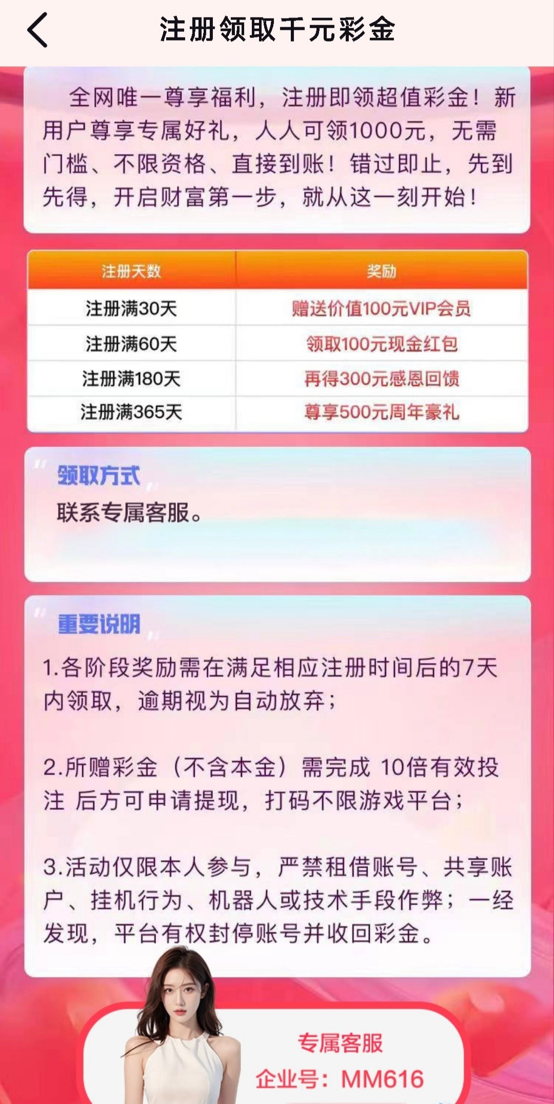 可以找专属客服询问一下自己的注册天数,符合会直接给你派送不需要充值,需要注册满60天以上才有,10倍流水不限制游戏